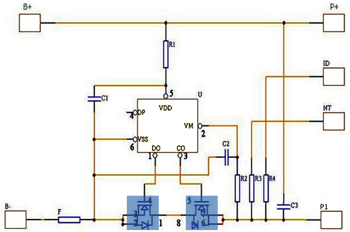 普通锂电池保护板通常包括控制IC、MOS开关、电阻、电容及辅助器件FUSE、PTC、NTC、ID、存储器等。其中控制IC,在一切正常的情况下控制 MOS开关导通,使电芯与外电路导通,而当电芯电压或回路电流超过规定值时,它立刻控制MOS开关关断,保护电芯安全。
